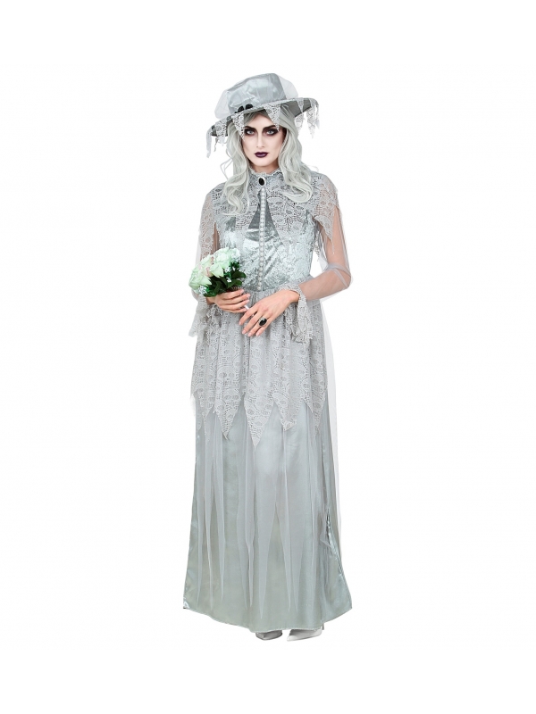Ce costume femme est inspiré des vieilles photos de mariage que l’on pourrait retrouver dans un grenier poussiéreux. Il est composé d’une robe de style 1900 avec des boutons, un voile en dentelle et un chapeau gris. Il est parfait pour se glisser dans la peau d’une mariée fantôme qui hante les lieux.